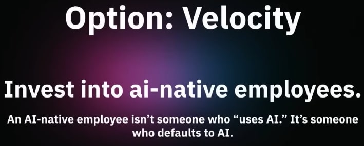 Ship daily/hourly via AI-native employees (blurred roles, full autonomy, trust).