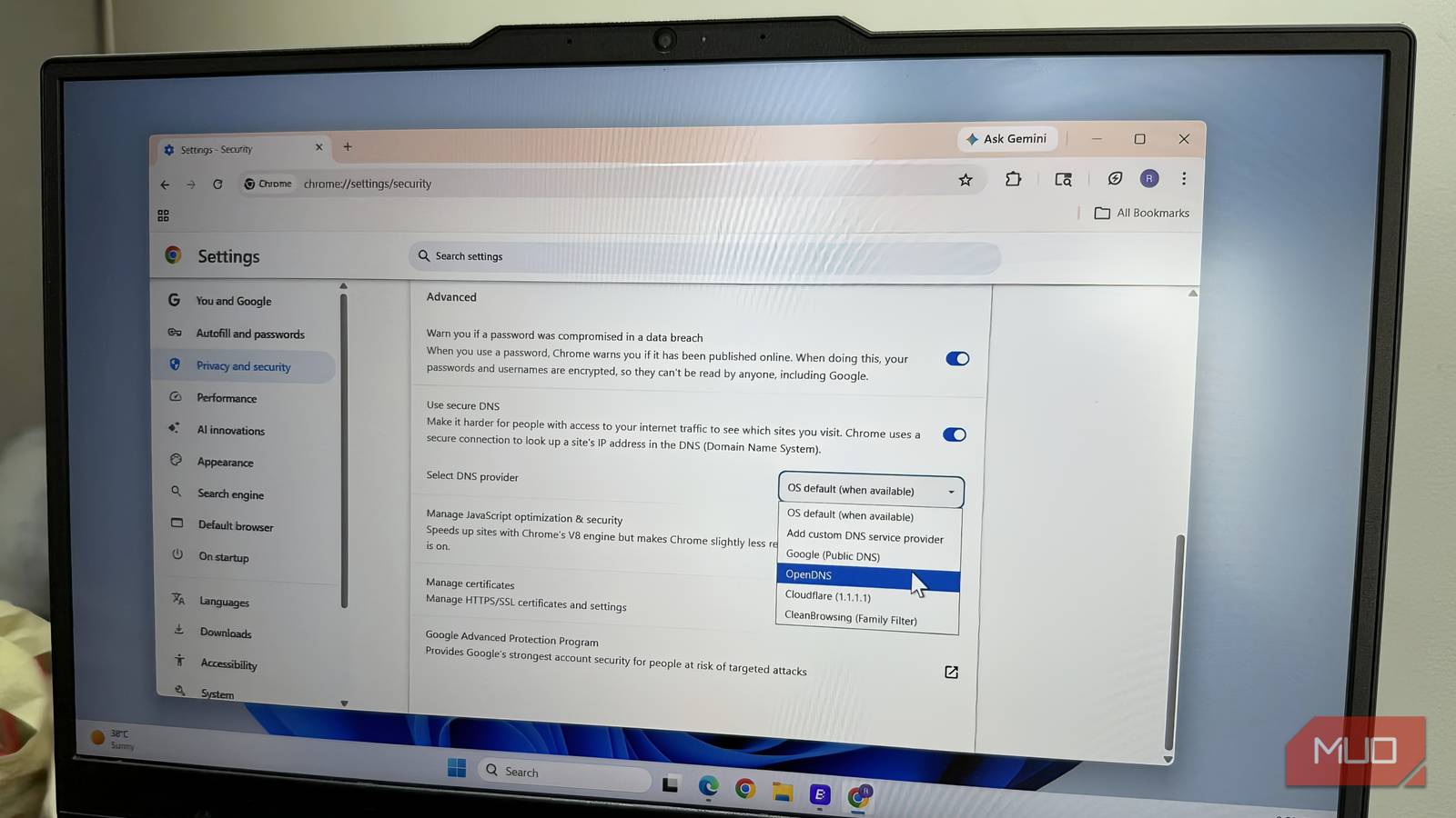 Open the browser settings, type DNS in the search bar, and then locate something called secure DNS or DNS over HTTPS. Enable it and then use the drop-down menu to pick your preferred DNS. If it’s not listed there, choose Custom, and add its address manually.