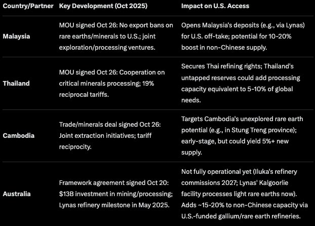 This is part of President Trump’s Southeast Asia tour to counter China’s supply chain influence. The deal builds on Malaysia’s growing rare earth sector (Lynas Rare Earths’ operations) and aims to integrate U.S. firms into Malaysian mining and processing.