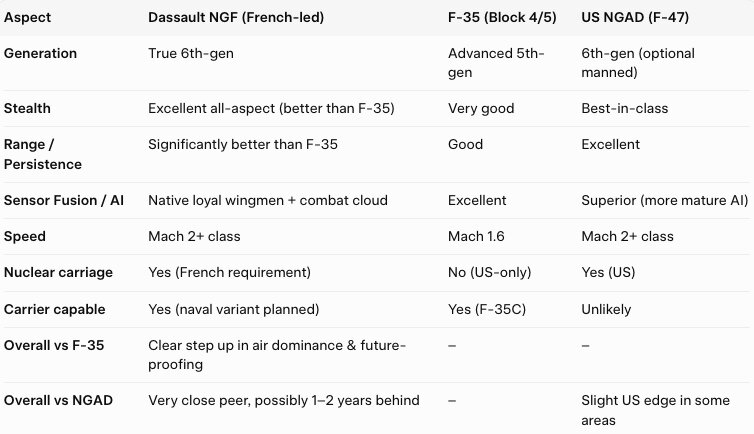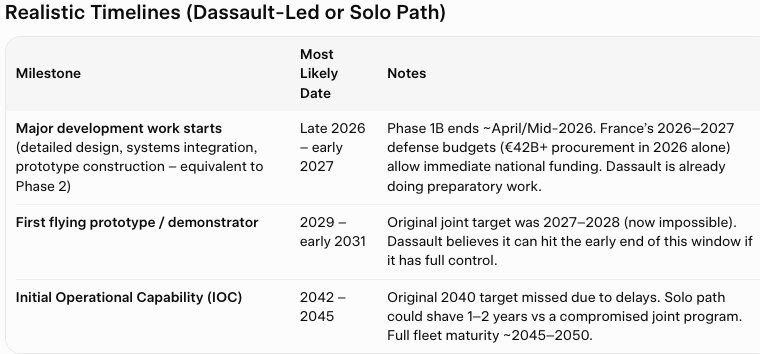 Dassault has zero equivalent flying hardware for the NGF. They are still at the digital design and subsystem testing stage. Their “we can build it alone and fly in 2029” claim assumes they get immediate full funding and leadership in the next few months — which is not yet guaranteed. Dassault is making a gen 4.5 fighter with the Rafale.