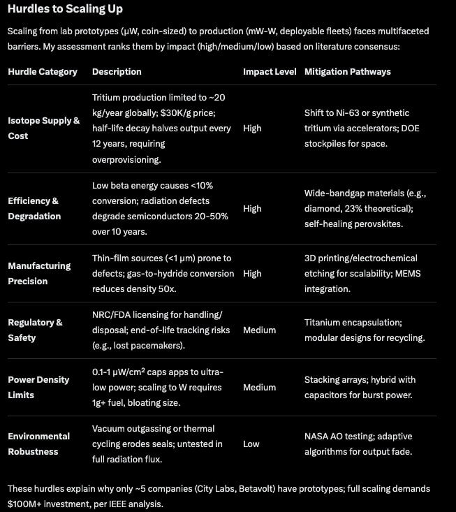 Tritium Battery Gets NASA’s Attention (ASME, 2023): Details NASA’s prototype collaboration with City Labs for tritium-based batteries in future missions, targeting 5 W/kg specific power for sensors.