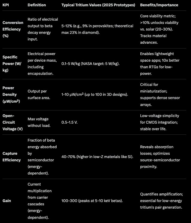 5 Watt per Kilogram Tritium Betavoltaic (NASA TechPort, ongoing): Tests regulatory-compliant packages for 5 W/kg batteries, focusing on reliability in space. Prototype validates 10 µW/cm² at 1 V.