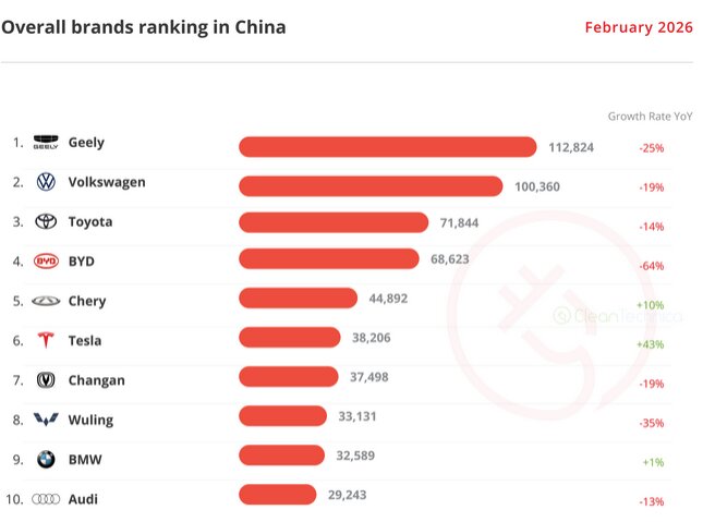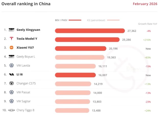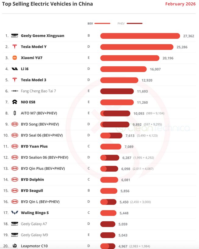 Tesla Model Y is the number 2 top selling vehicle in China and Tesla Model 3 is the 5th most sold EV in China. Only the $10,000 Geely Xingyuan sold more units in February 2026.